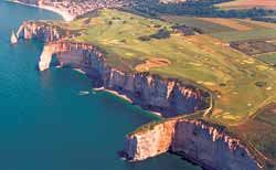 - zu den Klippen von Etretat, dem Golfparcour mit einer atemberaubenden Aussicht auf die vom Meer über Jahrhunderte geformten Kreidefelsen, den Strand, die Stadt und das weite Meer.